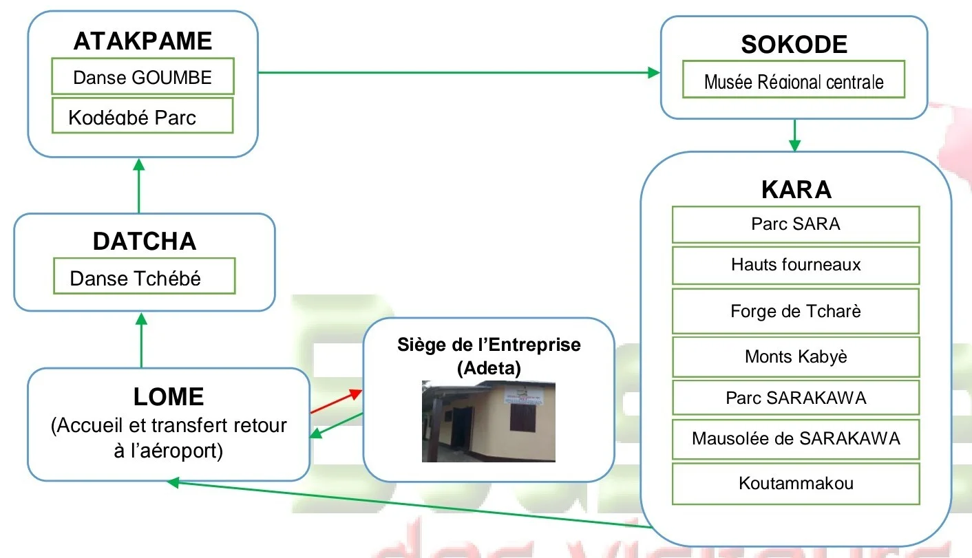 Quatre (04) Régions sur cinq (05) du Togo sont touchées par ce circuit (Maritime, Plateaux, Centrale et Kara).A travers ce circuit touristique, les visiteurs découvriront essentiellement : la ville d’Atakpamé ; cette ville encore appelée «ville des sept (07) collines» qui est une ville historique aménagée par les allemands offrant un beau paysage ; Le parc animalier d’Evoukodegbe (Kodegbe Parc) ; la danse traditionnelle «Tchébé», un patrimoine culturel immatériel propre à la communauté autochtone d’Atakpamé; la danse artistique GOUMBE d’Atakpamé, une musique où le tamtam se joue avec le talon; le site KOUTAMMAKOU communément appelé «site Tamberma» dans le Nord du Togo, un site culturel classé au Patrimoine mondial de l’UNESCO en 2008 et qui maintient sa position jusqu’à ce jour grâce à ses maisons en forme de châteaux appelées «Takienta» ou «Tata» montrant une architecture particulière. On y trouve des grottes, des maisons Baobab, la danse traditionnelle particulièrement conservée et un paysage très magnifique surtout en période de sécheresse.