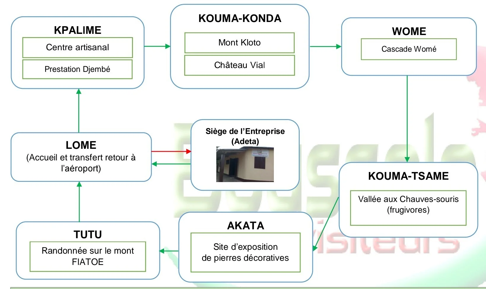 C’est aussi une occasion d’apprécier le monde artisanal de Kpalimé dans un climat particulièrement (des savoir-faire multiformes, une ambiance festive de la percussion djembé ; boutiques d’arts, diverses expositions d’objets d’arts…); le mont Kloto donnant une belle vue lointaine sur le Lac-Volta du Ghana; le château Vial qui est plein d’histoire; la cascade Womé, une belle cascade avec possibilité de baignade; la visite d’un site d’exploitation et d’exposition de pierres décoratives communément appelé « AKATAKPE ».Avec ce circuit, le visiteur découvrira également l’histoire intéressante sur l’exode du peuple Ewe de Kpele depuis la muraille d’Agokoli (Notsè) à travers une visite randonnée du Mont Tutu (TUTU-TO ou encore FIATOE)où sont conservés les vestiges ancestraux, preuve de l’occupation humaine (Pierres et roches pièges montées pour se défendre contre les attaques d’envahisseurs dans l’ancien temps).