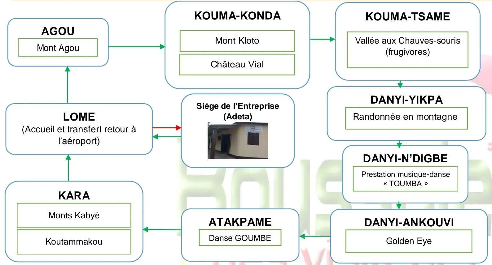 Ce circuit prend aussi en compte la visite du Mont Agou (le plus haut sommet du Togo avec 986m d’altitude); le mont Kloto donnant une belle vue lointaine sur le Lac-Volta du Ghana; le château Vial plein d’histoire et offrant une belle vue surtout sur la ville de Kpalimé; la vallée aux chauves-souris où on vit l’ambiance solidaire des milliers de chauves-souris exprimée par leur chants dans un environnement naturel ainsi que l’histoire sur leur occupation de la vallée et leur valeur dans l’histoire de la communauté résidente. Une visite dans la ville d’Atakpamé encore appelée «ville des sept (07) collines» qui est une ville historique offrant également un beau paysage avec un accent particulier sur la danse traditionnelle «Tchébé»; une gîte du nom de «Golden Eye» au sommet d’une montagne laissant une vue panoramique sur les villages d’Adeta, Agavé, un paysage très beau; Le site KOUTAMMAKOU (seul site classé au Patrimoine mondial de l’UNESCO grâce à ses maisons en forme de châteaux appelées «Takienta» ou «Tata» montrant une architecture particulière); On y trouve des grottes, des maisons Baobab et autres dans un paysage très magnifique surtout en période de sécheresse. Le circuit prévoit également la visite des Monts Kabyè présentant un relief multiformes, meublé de beaux paysages.