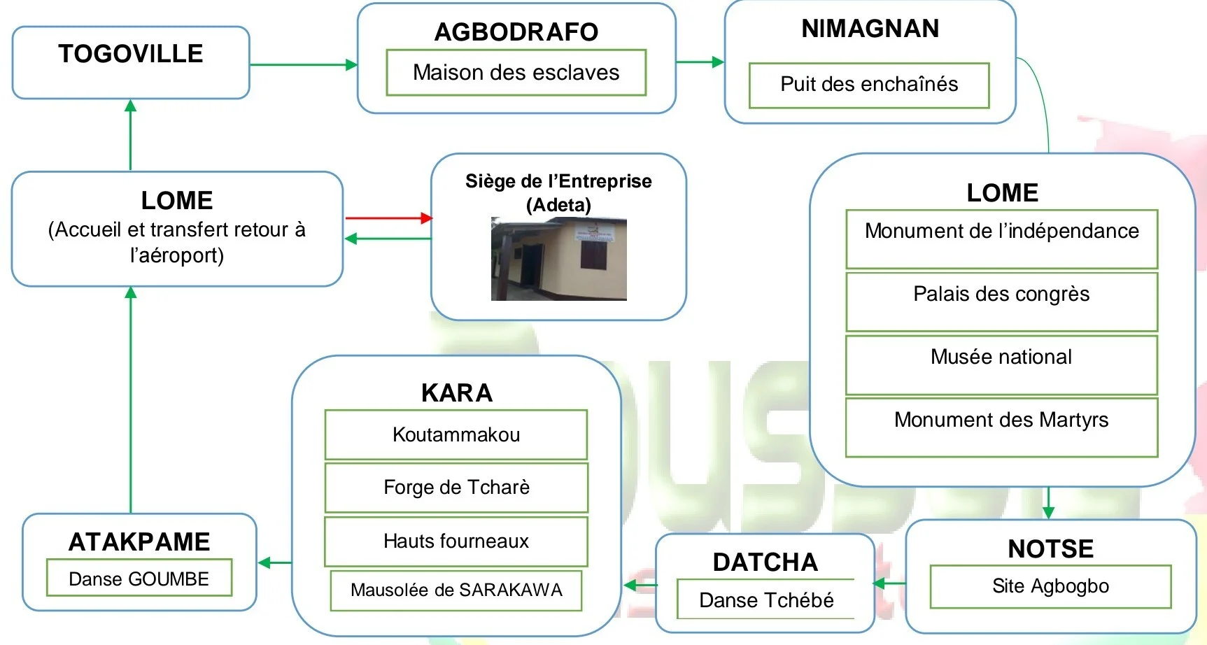 Il prend en compte: la visite de Togoville (arbres jumeaux, le monument du protectorat (signé entre Gustav Nachtigal et
